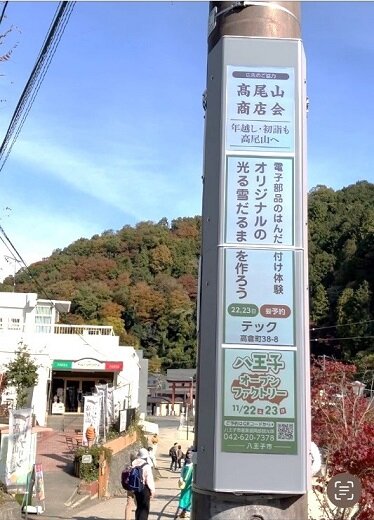 2025年11月15日(土)~11月23日(日)までの9日間にわたり、東京都八王子市内において、電子ペーパー技術を活用した電柱広告の実証を行いました。電子ペーパーは、屋外での高い視認性を維持でき、消費電力も極めて少ないため、都市空間における情報発信手段として非常に有効な媒体と考えております。