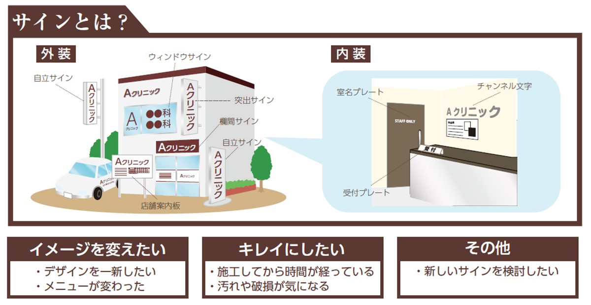 「診察券が古臭い」や「サインが破損したらどうしよう」といったお悩みがございましたら、統一したデザインでイメージアップを図るご提案をさせていただきます。