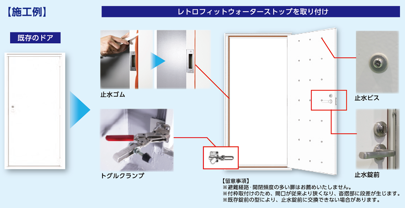 既設の扉を活用するため非常に安価であり、またドア枠も既設のものを活用するため止水扉への交換で行われるコンクリート打設などの作業もないため、1か所半日程度で施工ができます。